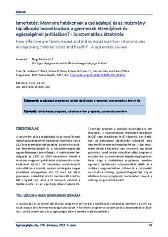 Nagy, Barbara (2017) Ismertetés: Mennyire hatékonyak a családalapú és az intézményi táplálkozási beavatkozások a gyermekek étrendjének és egészségének javításában? - Szisztematikus áttekintés = How effective are family-based and institutional nutrition interventions in improving children’s diet and health? - A systematic review. EGÉSZSÉGFEJLESZTÉS, 58 (4). p. 92. ISSN 1786-2434 (nyomtatott); 2498-6666 (elektronikus)