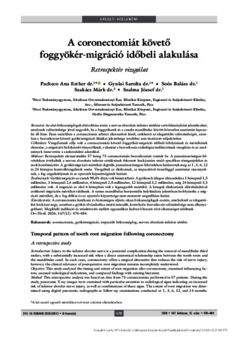 Pacheco, Ana Esther and Gyulai, Sarolta and Soós, Balázs and Szakács, Márk and Szalma, József (2026) A coronectomiát követő foggyökér-migráció időbeli alakulása : Retrospektív vizsgálat = Temporal pattern of tooth root migration following coronectomy : A retrospective study. ORVOSI HETILAP, 167 (12). pp. 476-484. ISSN 0030-6002