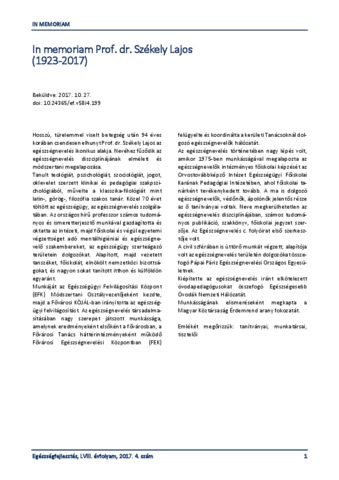 Vitrai, József (2017) In memoriam Prof. dr. Székely Lajos (1923-2017). EGÉSZSÉGFEJLESZTÉS, 58 (4). p. 1. ISSN 1786-2434 (nyomtatott); 2498-6666 (elektronikus)