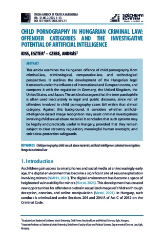Kiss, Eszter and Czebe, András (2025) Child Pornography in Hungarian Criminal Law: Offender Categories and the Investigative Potential of Artificial Intelligence. STUDIA JURIDICA ET POLITICA JAURINENSIS, 12 (2). pp. 1-13. ISSN 2064-5902
