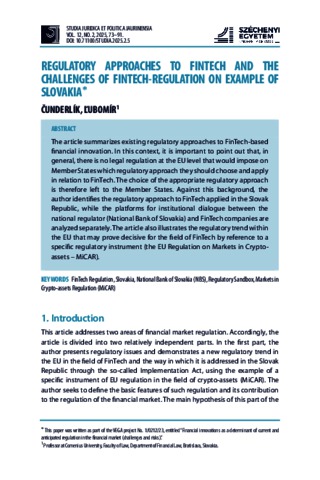 The article summarizes existing regulatory approaches to FinTech-based financial innovation. In this context, it is important to point out that, in general, there is no legal regulation at the EU level that would impose on Member States which regulatory approach they should choose and apply in relation to FinTech. The choice of the appropriate regulatory approach is therefore left to the Member States. Against this background, the author identifies the regulatory approach to FinTech applied in the Slovak Republic, while the platforms for institutional dialogue between the national regulator (National Bank of Slovakia) and FinTech companies are analyzed separately. The article also illustrates the regulatory trend within the EU that may prove decisive for the field of FinTech by reference to a specific regulatory instrument (the EU Regulation on Markets in Crypto-assets – MiCAR).