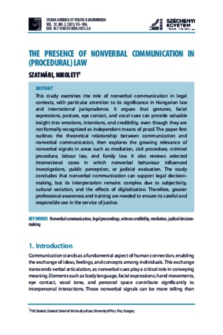 This study examines the role of nonverbal communication in legal contexts, with particular attention to its significance in Hungarian law and international jurisprudence. It argues that gestures, facial expressions, posture, eye contact, and vocal cues can provide valuable insight into emotions, intentions, and credibility, even though they are not formally recognized as independent means of proof. The paper first outlines the theoretical relationship between communication and nonverbal communication, then explores the growing relevance of nonverbal signals in areas such as mediation, civil procedure, criminal procedure, labour law, and family law. It also reviews selected international cases in which nonverbal behaviour influenced investigations, public perception, or judicial evaluation. The study concludes that nonverbal communication can support legal decision-making, but its interpretation remains complex due to subjectivity, cultural variation, and the effects of digitalisation. Therefore, greater professional awareness and training are needed to ensure its careful and responsible use in the service of justice.