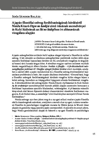 Soós, Sándor Balázs (2026) A japán filozófiai szöveg fordíthatóságának kérdéséről Nisida Kitaró Dzen no kenkjú című írásának szemelvényei és Kuki Súdzónak az Iki no kódzóhoz írt előszavának vizsgálata alapján. ORPHEUS NOSTER, 18 (1). pp. 15-27. ISSN 2061-456X