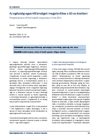 Tarkó, Klára (2019) Az egészség-egyenlőtlenségek megjelenítése a 60-as években = Presentations of the health inequities in the 60’s. EGÉSZSÉGFEJLESZTÉS, 60 (5). pp. 16-19. ISSN 1786-2434 (nyomtatott); 2498-6666 (elektronikus)