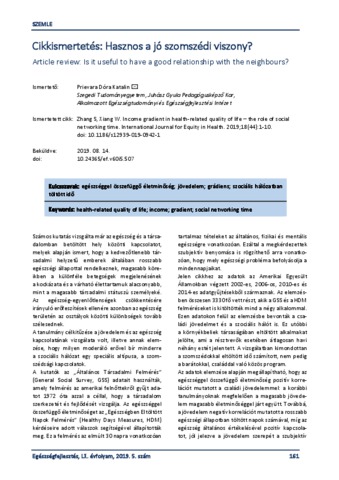 Prievara, Dóra Katalin (2019) Cikkismertetés: Hasznos a jó szomszédi viszony? = Article review: Is it useful to have a good relationship with the neighbours? EGÉSZSÉGFEJLESZTÉS, 60 (5). pp. 161-162. ISSN 1786-2434 (nyomtatott); 2498-6666 (elektronikus)