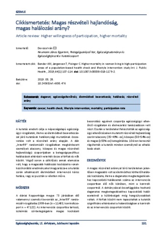 Devosa, Iván (2019) Cikkismertetés: Magas részvételi hajlandóság, magas halálozási arány? = Article review: Higher willingness of participation, higher mortality. EGÉSZSÉGFEJLESZTÉS, 60 (5). pp. 151-153. ISSN 1786-2434 (nyomtatott); 2498-6666 (elektronikus)