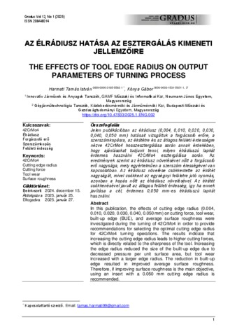 Harmati, Tamás István and Kónya, Gábor (2025) Az élrádiusz hatása az esztergálás kimeneti jellemzőire. GRADUS, 12 (1). ISSN 2064-8014