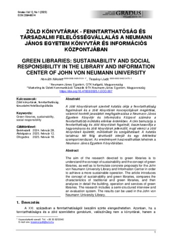 A zöld könyvtáraknak szentelt kutatás célja a fenntarthatóság fogalmának és a zöld könyvtárak koncepciójának megértése, valamint konkrét javaslatok megfogalmazása a Neumann János Egyetem Könyvtár és Információs Központ számára a fenntarthatóbb működés elérése érdekében. A cikk bemutatja a fenntarthatóság és zöld könyvtárak fogalmát, összehasonlítja a hagyományos és zöld könyvtárak jellemzőit, majd elemzi a zöld könyvtárak épületét, működését és szolgáltatásait. A kutatás tartalmaz két félig strukturált interjút és egy értékelési szempontrendszert. Az eredmények hasznosíthatóak lehetnek a Neumann János Egyetem Könyvtárában. The aim of the research devoted to green libraries is to understand the concept of sustainability and the concept of green libraries, as well as to formulate concrete proposals for the John von Neumann University Library and Information Center in order to achieve a more sustainable operation. The article introduces the concept of sustainability and green libraries, compares the characteristics of traditional and green libraries, and then analyzes in detail the building, operation and services of green libraries. The research includes a semi-structured interview and an evaluation system. The results can be used in the John von Neumann University Library.