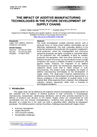 Császár, Loránd Csaba and Bóna, Krisztián (2025) The impact of additive manufacturing technologies in the future development of supply chains. GRADUS, 12 (1). ISSN 2064-8014