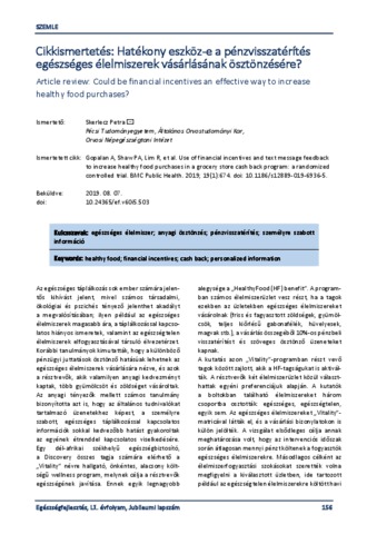 Skerlecz, Petra (2019) Cikkismertetés: Hatékony eszköz-e a pénzvisszatérítés egészséges élelmiszerek vásárlásának ösztönzésére? = Article review: Could be financial incentives an effective way to increase healthy food purchases? EGÉSZSÉGFEJLESZTÉS, 60 (5). pp. 156-157. ISSN 1786-2434 (nyomtatott); 2498-6666 (elektronikus)