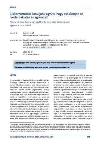 Járomi, Éva (2019) Cikkismertetés: Tanuljunk együtt, hogy csökkenjen az iskolai zaklatás és agresszió! = Article review: Learning together to decrease bullying and agression in schools! EGÉSZSÉGFEJLESZTÉS, 60 (5). pp. 158-160. ISSN 1786-2434 (nyomtatott); 2498-6666 (elektronikus)