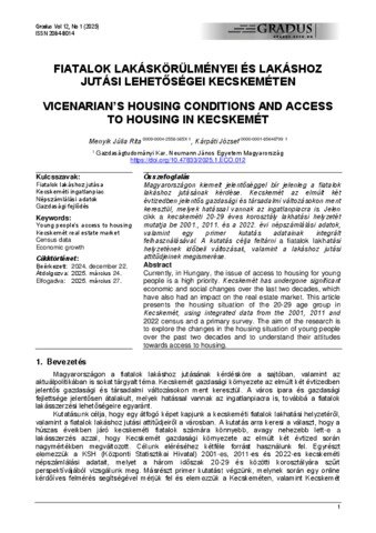 Magyarországon kiemelt jelentőséggel bír jelenleg a fiatalok lakáshoz jutásának kérdése. Kecskemét az elmúlt két évtizedben jelentős gazdasági és társadalmi változásokon ment keresztül, melyek hatással vannak az ingatlanpiacra is. Jelen cikk a kecskeméti 20-29 éves korosztály lakhatási helyzetét mutatja be 2001., 2011. és a 2022. évi népszámlálási adatok, valamint egy primer kutatás adatainak integrált felhasználásával. A kutatás célja feltárni a fiatalok lakhatási helyzetének időbeli változásait, valamint a lakáshoz jutási attitűdjeinek megismerése. Currently, in Hungary, the issue of access to housing for young people is a high priority. Kecskemét has undergone significant economic and social changes over the last two decades, which have also had an impact on the real estate market. This article presents the housing situation of the 20-29 age group in Kecskemét, using integrated data from the 2001, 2011 and 2022 census and a primary survey. The aim of the research is to explore the changes in the housing situation of young people over the past two decades and to understand their attitudes towards access to housing.