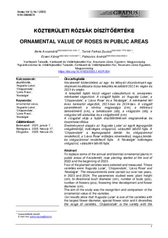 Beke, Annamária and Turiné Farkas, Zsuzsa Angéla and Ecseri, Károly and Palkovics, András (2025) Közterületi rózsák díszítőértéke = Ornamental value of roses in public areas. GRADUS, 12 (1). ISSN 2064-8014