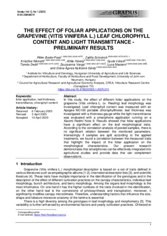 Bodor-Pesti, Péter and Zsófia, Schnörch and Németh, Erzsébet Krisztina and Hüvely, Attila and Gyula, Váradi and Deák, Tamás and Varga, Zsuzsanna and Luca, Masiero and Nyitrainé Sárdy, Diána (2025) The effect of foliar applications on the grapevine (Vitis vinifera L.) leaf Chlorophyll content and light transMittance : preliminary results. GRADUS, 12 (1). ISSN 2064-8014