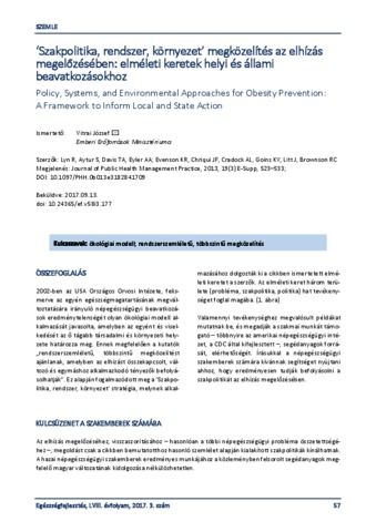Vitrai, József (2017) ‘Szakpolitika, rendszer, környezet’ megközelítés az elhízás megelőzésében: elméleti keretek helyi és állami beavatkozásokhoz = Policy, Systems, and Environmental Approaches for Obesity Prevention: A Framework to Inform Local and State Action. EGÉSZSÉGFEJLESZTÉS, 58 (3). pp. 57-58. ISSN 1786-2434 (nyomtatott); 2498-6666 (elektronikus)