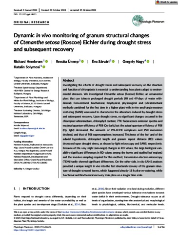 Hembrom, Richard and Ünnep, Renáta and Sárvári, Éva and Nagy, Gergely and Solymosi, Katalin (2025) Dynamic in vivo monitoring of granum structural changes of Ctenanthe setosa (Roscoe) Eichler during drought stress and subsequent recovery. PHYSIOLOGIA PLANTARUM, 177 (1). ISSN 0031-9317 (In Press)