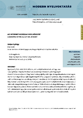 Additional Information: Első megjelenés:Szépe, Gy. (1997). Az internet-korszak nyelvészete. Modern Nyelvoktatás, 3(1–2), 76-89. MTMT 22465097