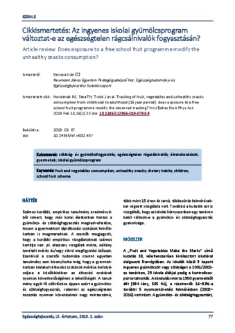 Devosa, Iván (2019) Cikkismertetés: Az ingyenes iskolai gyümölcsprogram változtat-e az egészségtelen rágcsálnivalók fogyasztásán? = Article review: Does exposure to a free school fruit programme modify the unhealthy snacks consumption? EGÉSZSÉGFEJLESZTÉS, 60 (2). pp. 77-78. ISSN 1786-2434 (nyomtatott); 2498-6666 (elektronikus)
