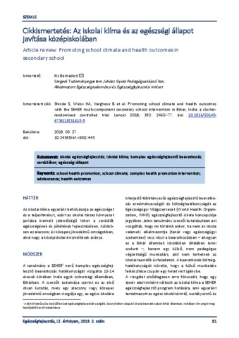 Kis, Bernadett (2019) Cikkismertetés: Az iskolai klíma és az egészségi állapot javítása középiskolában = Article review: Promoting school climate and health outcomes in secondary school. EGÉSZSÉGFEJLESZTÉS, 60 (2). pp. 81-82. ISSN 1786-2434 (nyomtatott); 2498-6666 (elektronikus)