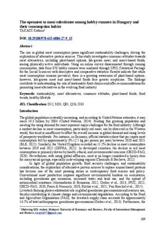 Takacs, Kathrin (2026) The openness to meat substitutes among hobby runners in Hungary and their consumption habits. In: ESG - RISK MANAGEMENT OR NEW SUSTAINABILITY? Budapesti Gazdaságtudományi Egyetem (BGE), Budapest, pp. 189-201. ISBN 9786156886279