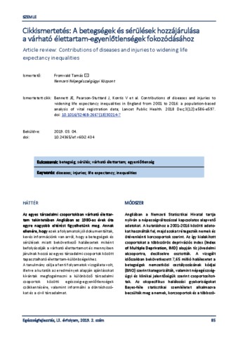 Fromvald, Tamás (2019) Cikkismertetés: A betegségek és sérülések hozzájárulása a várható élettartam-egyenlőtlenségek fokozódásához = Article review: Contributions of diseases and injuries to widening life expectancy inequalities. EGÉSZSÉGFEJLESZTÉS, 60 (2). pp. 85-86. ISSN 1786-2434 (nyomtatott); 2498-6666 (elektronikus)