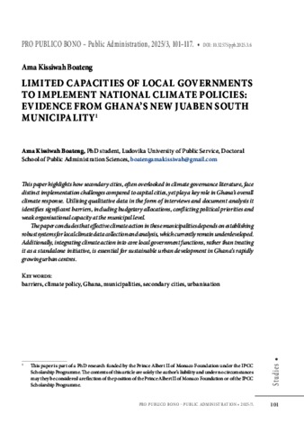 Boateng, Ama Kissiwah (2025) Limited Capacities of Local Governments to Implement National Climate Policies: Evidence from Ghana’s New Juaben South Municipality. PRO PUBLICO BONO: MAGYAR KÖZIGAZGATÁS; A NEMZETI KÖZSZOLGÁLATI EGYETEM KÖZIGAZGATÁS-TUDOMÁNYI SZAKMAI FOLYÓIRATA, 13 (3). pp. 101-117. ISSN 2063-9058