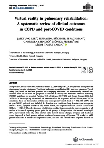 Lee, Jaekyung and Büchner Strachman, Fernanda and Szendrő, Gabriella and Fekete, Mónika and Varga, János Tamás (2026) Virtual reality in pulmonary rehabilitation: A systematic review of clinical outcomes in COPD and post-COVID conditions. PHYSIOLOGY INTERNATIONAL, 113 (1). pp. 34-63. ISSN 2498-602X