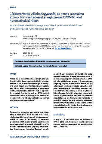 Varga, Szabolcs (2019) Cikkismertetés: Alkoholfogyasztás, és annak kapcsolata az impulzív viselkedéssel az egészséges OPRM1G allél hordozóinak körében = Article review: Alcohol consumption in healthy OPRM1G allele carriers and its association with impulsive behavior. EGÉSZSÉGFEJLESZTÉS, 60 (3). pp. 91-92. ISSN 1786-2434 (nyomtatott); 2498-6666 (elektronikus)