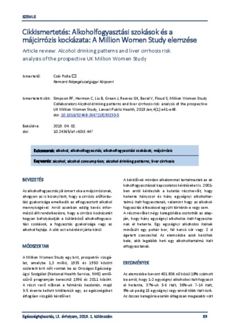 Czér, Polla (2019) Cikkismertetés: Alkoholfogyasztási szokások és a májcirrózis kockázata: A Million Women Study elemzése = Article review: Alcohol drinking patterns and liver cirrhosis risk: analysis of the prospective UK Million Women Study. EGÉSZSÉGFEJLESZTÉS, 60 (3). pp. 89-90. ISSN 1786-2434 (nyomtatott); 2498-6666 (elektronikus)