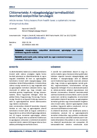 Kaposvári, Csilla (2019) Cikkismertetés: A népegészségügyi termékadókból levonható szakpolitikai tanulságok = Article review: Policy lessons from health taxes: a systematic review of empirical studies. EGÉSZSÉGFEJLESZTÉS, 60 (3). pp. 80-83. ISSN 1786-2434 (nyomtatott); 2498-6666 (elektronikus)
