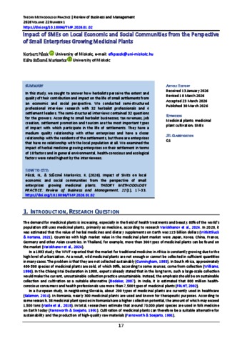 Pászk, Norbert and Szűcsné Markovics, Klára (2026) Impact of SMEs on Local Economic and Social Communities from the Perspective of Small Enterprises Growing Medicinal Plants. THEORY METHODOLOGY PRACTICE: CLUB OF ECONOMICS IN MISKOLC, 22 (01). pp. 17-33. ISSN 1589-3413