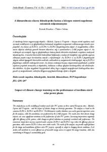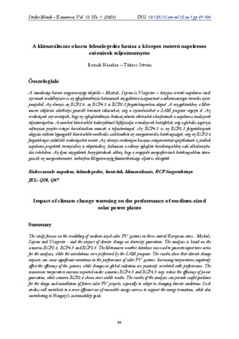 A tanulmány három magyarországi település – Miskolc, Sopron és Veszprém – közepes méretű napelemes rendszereinek modellezésére és az éghajlatváltozás hatásainak vizsgálatára összpontosít a villamosenergia-termelés szempontjából. Az elemzés az RCP2.6, az RCP4.5 és RCP8.5 forgatókönyveken alapul. A vizsgálatokhoz a Meteonorm időjárási adatbázis generált bemeneti idősorokat, míg a szimulációkat a SAM program végezte el. Az eredmények azt mutatják, hogy az éghajlatváltozás hatásai jelentős eltéréseket okozhatnak a napelemes rendszerek teljesítményében. A növekvő hőmérséklet kedvezőtlenül befolyásolja a rendszerek hatásfokát, míg a globális sugárzás változásai pozitív irányú korrelációban vannak a teljesítménnyel. Az RCP4.5 és az RCP8.5 forgatókönyvek alapján várható legnagyobb hőmérséklet-emelkedés csökkentheti az energiatermelés hatékonyságát, míg az RCP2.6 forgatókönyv stabilabb eredményeket mutat. Az elemzés eredményei hasznos iránymutatást nyújthatnak a jövőbeli napelemes projektek tervezéséhez és telepítéséhez, különösen a változó éghajlati körülményekhez való alkalmazkodás érdekében. Az ilyen vizsgálatok hozzájárulnak ahhoz, hogy a megújuló energiaforrások hatékonyabban támogassák az energiaátmenetet, miközben Magyarország fenntarthatósági céljait is elősegítik. | The study focuses on the modelling of medium-sized solar PV systems in three central European cities - Miskolc, Sopron and Veszprém - and the impact of climate change on electricity generation. The analysis is based on the scenarios RCP2.6, RCP4.5 and RCP8.5. The Meteonorm weather database was used to generate input time series for the analyses, while the simulations were performed by the SAM program. The results show that climate change impacts can cause significant variations in the performance of solar PV systems. Increasing temperatures negatively affect the efficiency of the systems, while changes in global radiation are positively correlated with performance. The maximum temperature increase expected under scenarios RCP4.5 and RCP8.5 may reduce the efficiency of power generation, while scenario RCP2.6 shows more stable results. The results of the analysis can provide useful guidance for the design and installation of future solar PV projects, especially to adapt to changing climate conditions. Such studies will contribute to a more efficient use of renewable energy sources to support the energy transition, while also contributing to Hungary's sustainability goals.