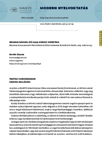 Kurtán, Zsuzsa (2025) Brassai Sámuel-díj 2025: Károly Krisztina : Magyar Alkalmazott Nyelvészek és Nyelvtanárok Egyesülete, Eszék, 2025. április 14. MODERN NYELVOKTATÁS, 31 (3-4). pp. 151-153. ISSN 1219-638X
