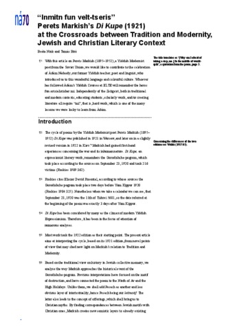 Nink, Beáta and Biró, Tamás (2017) “Inmitn fun velt-tseris” : Perets Markish’s Di Kupe (1921) at the Crossroads between Tradition and Modernity, Jewish and Christian Literary Context. In: 70 snippets to mark Ádám Nádasdy’s 70th birthday. ELTE BTK Angol-Amerikai Intézet, Budapest. ISBN 9789632848501