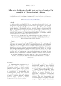 Az infokommunikációs technológiák (IKT) alapvető szerepet játszanak a társadalmi részvétel és azönálló életvitel támogatásában, a fogyatékossággal élő személyek számára azonban a digitális térbentovábbra is számos hozzáférési akadály van jelen. A tanulmány célja az IKT-használati szokások, adigitális akadályok és az érdekvédelmi szervezetek szerepének vizsgálata a fogyatékossággal élőkkörében. A kutatás kérdőíves adatfelvételre és strukturált interjúkra épül. Az eredmények szerint azIKT-eszközök elsősorban kommunikációs célokat szolgálnak, míg az online ügyintézés és a tanulásterületén jelentős hozzáférési és kompetenciahiányok tapasztalhatók. A tanulmány gyakorlatiajánlásokat fogalmaz meg az inkluzív digitális környezet fejlesztésére. | Information and communication technologies (ICT) play a fundamental role in supporting social participation and independent living; however, for persons with disabilities, the digital environment still presents numerous accessibility barriers. The aim of this study is to examine ICT usage patterns, digital barriers, and the role of advocacy organizations among people with disabilities. The research is based on a mixed-method approach, combining questionnaire-based data collection and structured interviews. The findings indicate that ICT tools are primarily used for communication purposes, while significant access and competence gaps remain in online administration and learning. The study formulates practical recommendations to support the development of an inclusive digital environment.