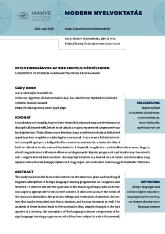 tanulmány azt vizsgálja, hogy milyen tényezők határozzák meg a nyelvtudományi diszciplínák összetételét, helyét és oktatását a magyar egyetemek idegennyelv-szakos képzéseiben. Választ keres arra a kérdésre, hogy a nyelvészet oktatása különböző aspektusaiban megfelel-e a jelenlegi kontextusnak. Sorra veszi a különböző érintett szereplők igényeit, a hallgatók előismereteit és motivációit, a tantervbe illeszthető tartalmakat és a humán erőforrásokat is. E tényezők vizsgálata arra a következtetésre vezet, hogy az elmúlt negyedszázad változásai ellenére az idegennyelvi képzési programok nyelvtudományi összetevőinek – szigorú keretek közé szorított – koncepciója továbbra is a keretek és a tartalom szisztematikus megújítását célzó reflexiók középpontjában kell, hogy álljon, ami széleskörű szakmai együttműködést feltételez. | The study examines the factors that determine the structure, place and teaching of linguistic disciplines in foreign language training programmes at Hungarian universities, in order to answer the question: is the teaching of linguistics in its various aspects appropriate to the current context. It takes into account the needs of the various stakeholders, the prior knowledge and motivation of students, the content that can be integrated into the curriculum, and human resources as well. The analysis of these factors leads to the conclusion that, despite changes in the last quarter of a century, the conception of the language sciences components of foreign language training programmes, which has been subject to a strict framework, must remain an essential concern for reflection aimed at a systematic renewal of its framework and content, which implies broad professional collaboration.