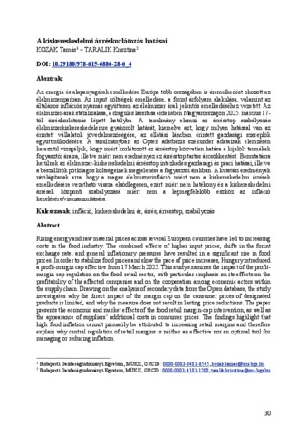 Az energia és alapanyagárak emelkedése Európa több országában is áremelkedést okozott az élelmiszeriparban. Az input költségek emelkedése, a forint árfolyam alakulása, valamint az általános inflációs nyomás együttesen az élelmiszer árak jelentős emelkedéséhez vezetett. Az élelmiszer-árak stabilizálása, a drágulás lassítása érdekében Magyarországon 2025. március 17-től árréskorlátozás lépett hatályba. A tanulmány elemzi az árrésstop szabályozás élelmiszerkiskereskedelemre gyakorolt hatását, kiemelve azt, hogy milyen hatással van az érintett vállalatok jövedelmezőségére, az ellátási láncban érintett gazdasági szereplők együttműködésére. A tanulmányban az Opten adatbázis szekunder adatainak elemzésén keresztül vizsgáljuk, hogy miért korlátozott az árrésstop közvetlen hatása a kijelölt termékek fogyasztói áraira, illetve miért nem eredményez az árrésstop tartós árcsökkentést. Bemutatásra kerülnek az élelmiszer-kiskereskedelmi árrésstop intézkedés gazdasági és piaci hatásai, illetve a beszállítók pótlólagos költségeinek megjelenése a fogyasztói árakban. A kutatási eredmények rávilágítanak arra, hogy a magas élelmiszerinfláció miért nem a kiskereskedelmi árrések emelkedésére vezethető vissza elsődlegesen, ezért miért nem hatékony és a kiskereskedelmi árrések központi szabályozása miért nem a legmegfelelőbb eszköz az infláció kezelésére/visszaszorítására.