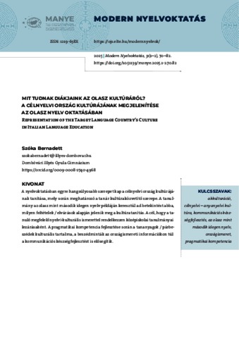 A nyelvoktatásban egyre hangsúlyosabb szerepet kap a célnyelvi ország kultúrájának tanítása, mely során meghatározó a tanár kultúraközvetítő szerepe. A tanulmány az olasz mint második idegen nyelv példáján keresztül ad betekintést abba, milyen feltételek / elvárások alapján jelenik meg a kultúratanítás. A cél, hogy a tanuló megfelelő nyelvi-kulturális ismerettel rendelkezzen középiskolai tanulmányai lezárásaként. A pragmatikai kompetencia fejlesztése során a tananyagok / párbeszédek kulturális tartalma, a beszédminták az országismereti információkon túl a kommunikációs készségfejlesztést is elősegítik. | Teaching the culture of the target-language country is becoming increasingly important in language education, with the teacher’s role as a cultural mediator being particularly significant. This study provides an insight into the conditions and expectations that shape cultural instruction, using Italian as a foreign language as an example. The ultimate goal is for students to acquire sufficient linguistic and cultural knowledge by the end of their secondary education. In developing pragmatic competence, the cultural content of learning materials and dialogues, as well as speech patterns, not only convey cultural and geographical knowledge but also contribute to the development of communication skills.