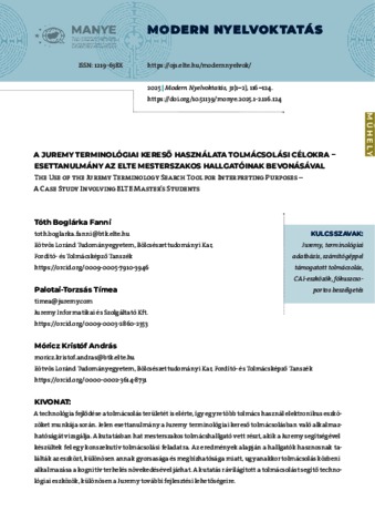 Tóth, Boglárka Fanni and Palotai-Torzsás, Tímea and Móricz, Kristóf András (2025) A Juremy terminológia-kereső használata tolmácsolási célokra – esettanulmány az ELTE mesterszakos hallgatóinak bevonásával = The Use of the Juremy Terminology Search Tool for Interpreting Purposes – A Case Study Involving ELTE Master’s Students. MODERN NYELVOKTATÁS, 31 (1–2). pp. 116-124. ISSN 1219-638X