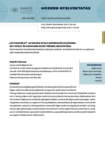 Szánthó, Zsuzsa (2025) „Jó gyakorlat” az idegen nyelvi szorongás oldására: egy nyelvi és kommunikációs tréning bemutatása = Good practice in reducing foreign language anxiety: An introduction to a language and communication training. MODERN NYELVOKTATÁS, 31 (1–2). pp. 125-136. ISSN 1219-638X