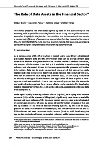 Izsák, Gábor and Palicz, Alexandr and Szász, Katinka and Varga, Balázs (2022) The Role of Data Assets in the Financial Sector. FINANCIAL AND ECONOMIC REVIEW, 21 (1). pp. 164-173. ISSN 2415-9271 (print); 2415–928X (online)