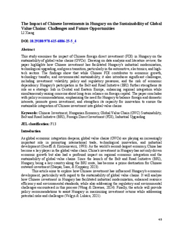 Li, Xiang (2026) The Impact of Chinese Investments in Hungary on the Sustainability of Global Value Chains: Challenges and Future Opportunities. In: Futures in the making - Developing and adapting futures in business - BUEB Day of Hungarian Science 2024. Budapesti Gazdaságtudományi Egyetem, Budapest, pp. 49-59. ISBN 9786156886255