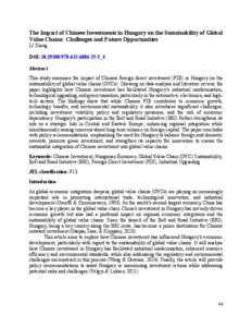 This study examines the impact of Chinese foreign direct investment (FDI) in Hungary on the sustainability of global value chains (GVCs). Drawing on data analysis and literature review, the paper highlights how Chinese investment has facilitated Hungary’s industrial modernization, technological upgrading, and green transition, particularly in the automotive, electronics, and high-tech sectors. The findings show that while Chinese FDI contributes to economic growth, technology transfer, and environmental sustainability, it also introduces significant challenges, including investment volatility, policy and regulatory pressures, and the risk of economic dependency. Hungary’s participation in the Belt and Road Initiative (BRI) further strengthens its role as a strategic hub in Central and Eastern Europe, enhancing regional integration while simultaneously raising concerns about long-term reliance on foreign capital. The paper concludes with policy recommendations, emphasising the need for Hungary to balance foreign and domestic interests, promote green investment, and strengthen its capacity for innovation to ensure the sustainable integration of Chinese investment into global value chains.