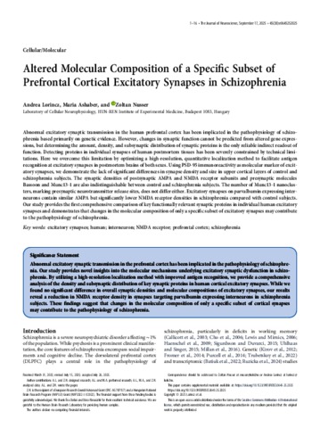 Lőrincz, Andrea and Aschaber, Mária and Nusser, Zoltán (2025) Altered Molecular Composition of a Specific Subset of Prefrontal Cortical Excitatory Synapses in Schizophrenia. JOURNAL OF NEUROSCIENCE, 45 (38). pp. 1-16. ISSN 0270-6474 (print); 1529-2401 (online)