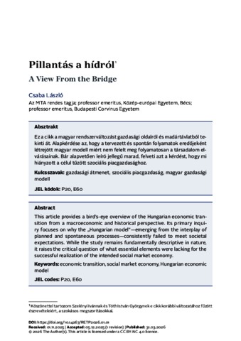 Ez a cikk a magyar rendszerváltozást gazdasági oldalról és madártávlatból tekinti át. Alapkérdése az, hogy a tervezett és spontán folyamatok eredőjeként létrejött magyar modell miért nem felelt meg folyamatosan a társadalom elvárásainak. Bár alapvetően leíró jellegű marad, felveti azt a kérdést, hogy mi hiányzott a célul tűzött szociális piacgazdasághoz. | This article provides a bird’s-eye overview of the Hungarian economic transition from a macroeconomic and historical perspective. Its primary inquiry focuses on why the „Hungarian model”—emerging from the interplay of planned and spontaneous processes—consistently failed to meet societal expectations. While the study remains fundamentally descriptive in nature, it raises the critical question of what essential elements were lacking for the successful realization of the intended social market economy.