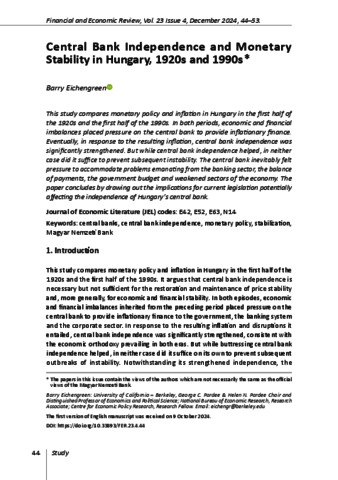 Eichengreen, Barry (2024) Central Bank Independence and Monetary Stability in Hungary, 1920s and 1990s. FINANCIAL AND ECONOMIC REVIEW, 23 (4). pp. 44-53. ISSN 2415-9271