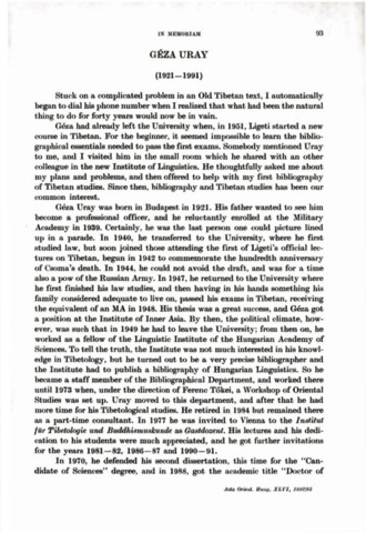 Róna-Tas, András (1993) In memoriam Géza Uray (1921–1991). ACTA ORIENTALIA ACADEMIAE SCIENTIARUM HUNGARICAE, 46 (1). pp. 93-96. ISSN 0001-6446