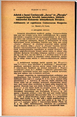 Nyárády, E. Gyula (1943) Adatok a hazai Centaureák "Jacea" és Phrygia" csoportjainak bővebb ismeretéhez, különös tekintettel Kolozsvár környékének flórájára : Additamenta ad cognitionem Centaurearum Hungariae. BOTANIKAI KÖZLEMÉNYEK, 40 (1-2). pp. 16-45.