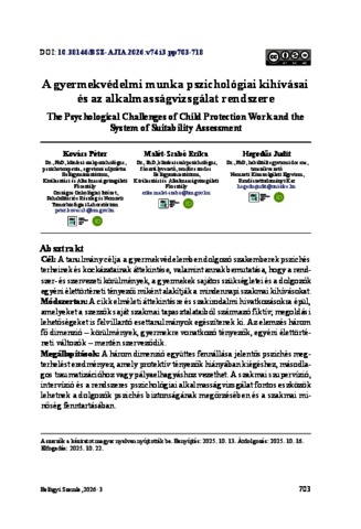 Kovács, Péter and Malét-Szabó, Erika and Hegedűs, Judit (2026) A gyermekvédelmi munka pszichológiai kihívásai és az alkalmasságvizsgálat rendszere = The Psychological Challenges of Child Protection Work and the System of Suitability Assessment. BELÜGYI SZEMLE / ACADEMIC JOURNAL OF INTERNAL AFFAIRS: A BELÜGYMINISZTÉRIUM SZAKMAI TUDOMÁNYOS FOLYÓIRATA (2010-), 74 (3). pp. 703-718. ISSN 2062-9494