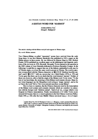 Róna-Tas, András (2004) Khitan word for 'marmot'. ACTA ORIENTALIA ACADEMIAE SCIENTIARUM HUNGARICAE, 57. pp. 27-29. ISSN 0001-6446